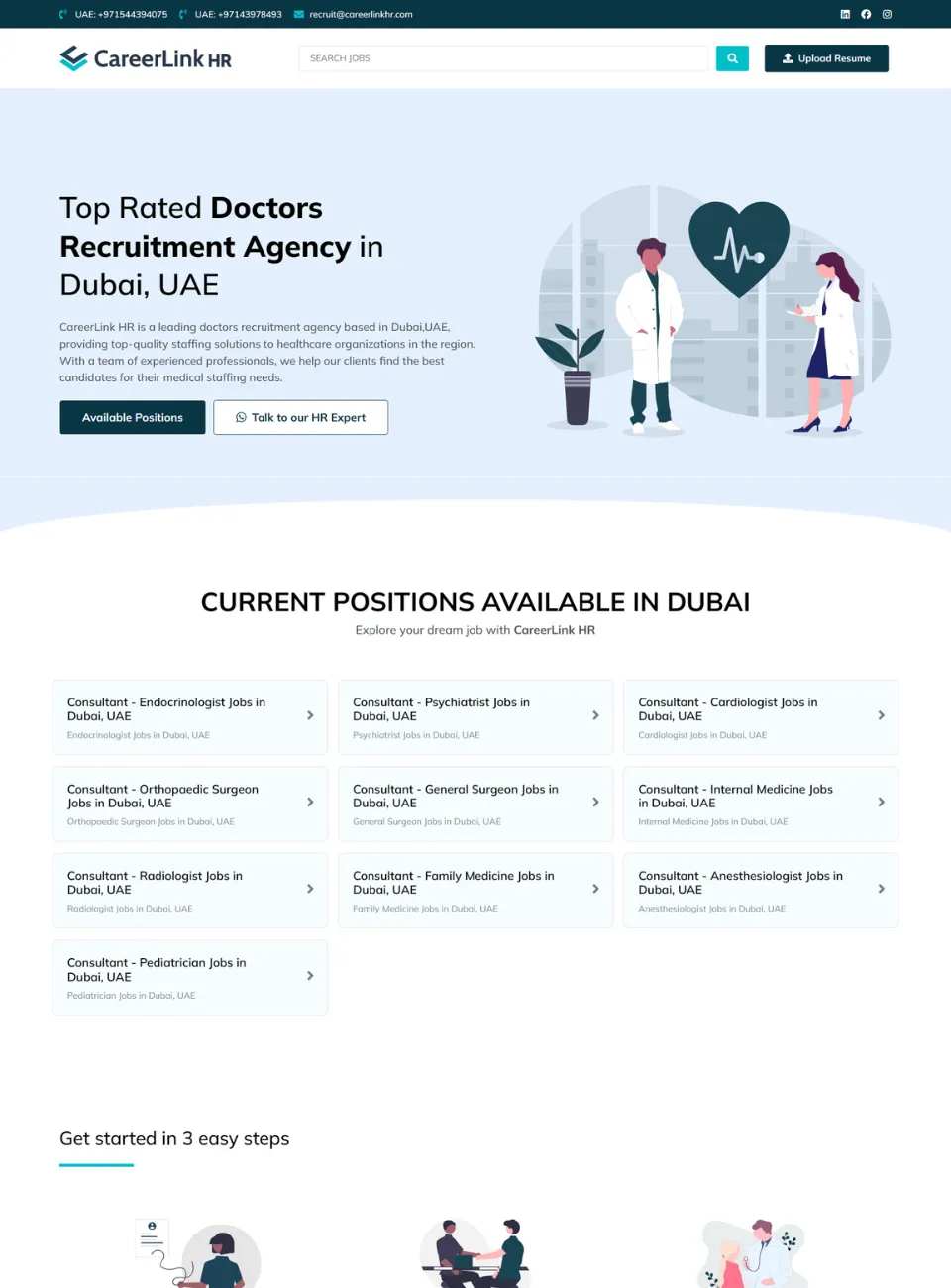 The goal of the website for CareerLink HR was to create a landing page for Google Ads that was focused on conversion and the clear display of vacancies available for doctors in the UAE. The main objective was to list out the